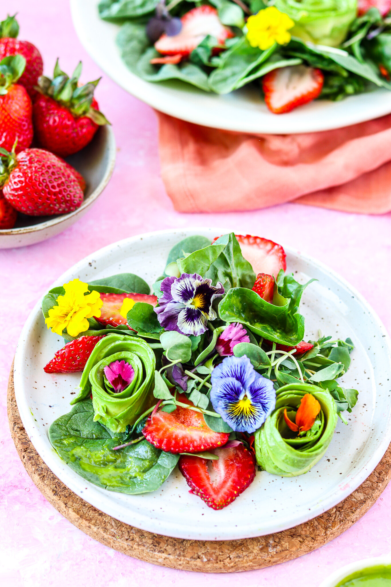 Add the spinach, avocado, strawberries, pea shoots, edible flower petals into a large bowl and toss